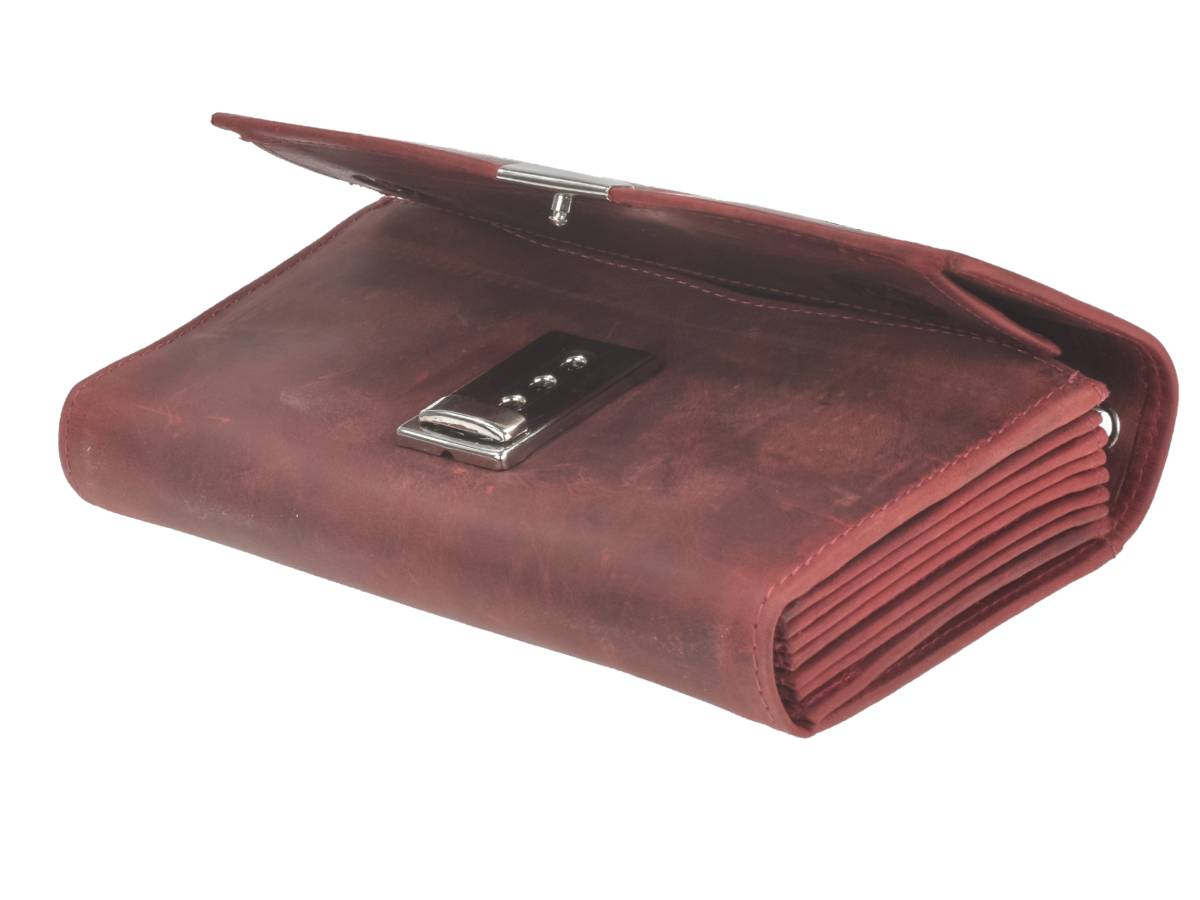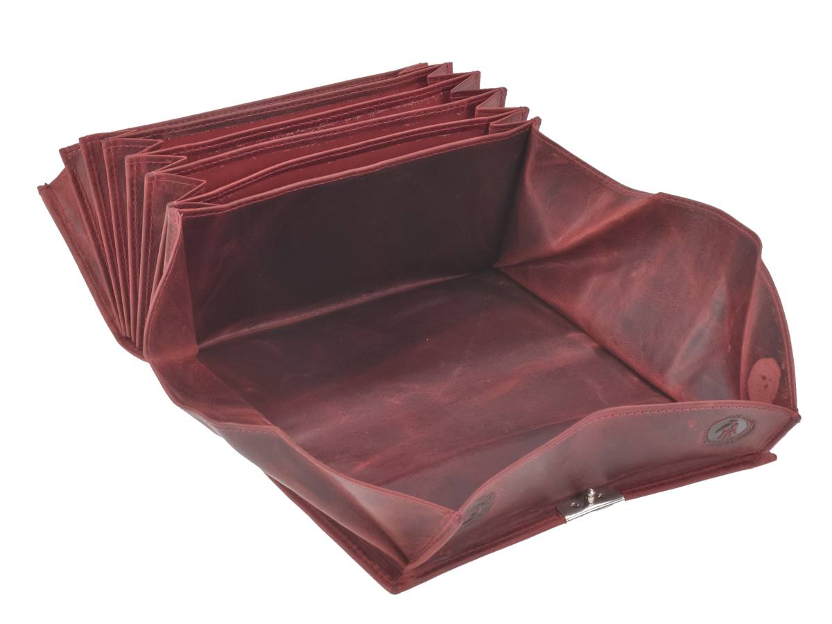 Die Greenburry Kellnerbörse aus Leder bietet Angestellten in der Gastronomie einen einzigartigen Blickfang: Für den angesagten used-Look wurde rustikales Leder verarbeitet, welches naturbelassen hergestellt und sauber verarbeitet wurde. Diese edle Bedienungsbörse besticht dabei durch eine große Anzahl kleiner Fächer für Münzen und Scheine und wird über ein Schnappschloß verschlossen. Zusätzlich befinden sich Einsteckfächer, beispielsweise für Rechnungen, an der Außenseite der Börse. Das geschliffene Rindleder ist für seine Langlebigkeit bekannt und wird durch häufige Benutzung zu einem absolut individuellen Unikat. In unscheinbar-niveauvollem Vintage oliv gehalten, verleiht der verarbeitete Werkstoff der Kellnergeldtasche aus Leder einen unverwechselbaren Charme und dem Träger somit das "gewisse Etwas".